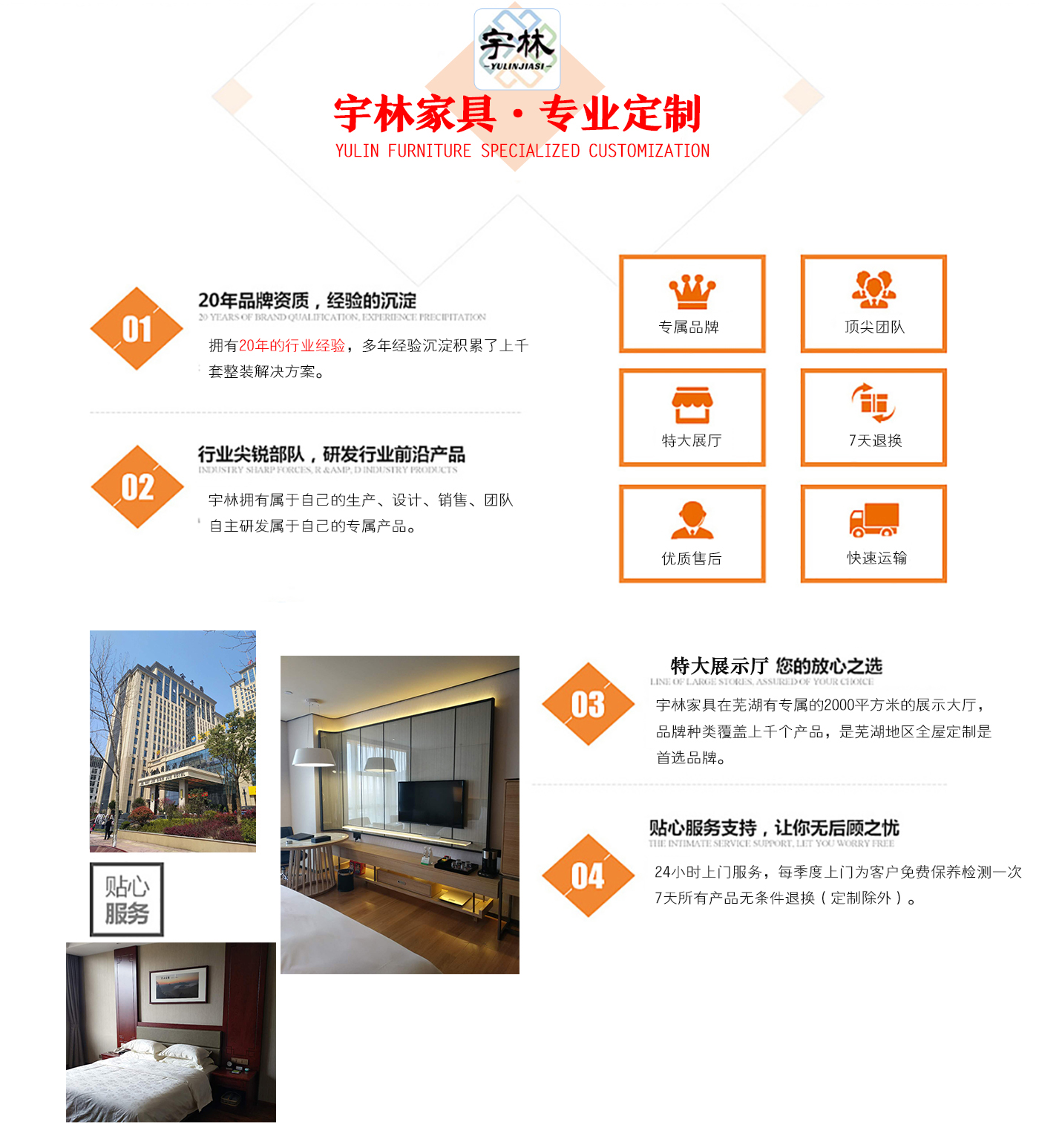 蕪湖宇林工貿(mào)有限公司創(chuàng)建于1996年,位于蕪湖高新技術(shù)開發(fā)區(qū)南區(qū),占地面積13000余平方米。是一個集研發(fā)、設(shè)計為一體的綜合性公司,公司主營整體家居定制、酒店家具定制、娛樂場所配套家具以及軟體系列,團(tuán)隊(duì),銳意革新、進(jìn)去不息的理念,逐漸成為蕪湖家具行業(yè)的生產(chǎn)廠家,并在2006年注冊了“宇林”牌商標(biāo)。宇林品牌家具依現(xiàn)代與古典相結(jié)合的多種實(shí)木家具、實(shí)木貼皮家具。家具做工精細(xì),多用人工雕刻;其自然、典雅的風(fēng)格在很大程度上引導(dǎo)著人...